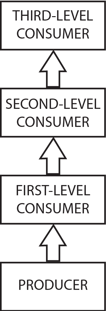 Look at the example of an energy pyramid above. Then imagine a different food chain and energy pyramid: grass is eaten by a mouse, which is eaten by a snake, which is eaten by a hawk. The primary-producer level of grass contains 1,000 units of energy; the primary-consumer level of mice contains 100 units of energy; the secondary-consumer level of snakes contains 10 units of energy; the tertiary-consumer level of hawks contains only 1 unit of energy.
