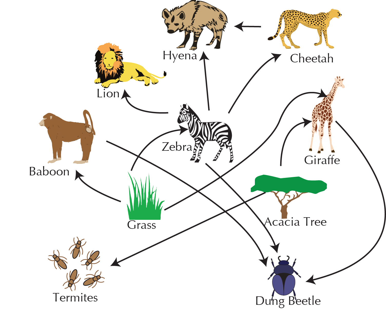 | This food web is of a savanna in Africa; each ecosystem has its own unique food web in which every species has its own niche, or role in the ecosystem. |